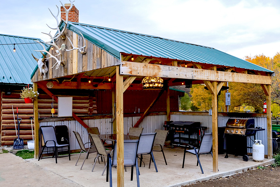 Our new covered outdoor kitchen lets you cook and enjoy meals in the fresh mountain air. Equipped with a grill and plenty of seating, it’s the perfect spot to relax after a day of adventure.